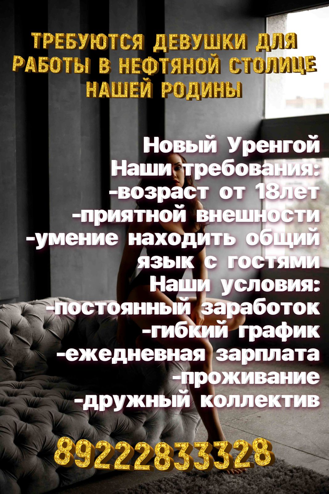 Требуются девушки на работу новый уренгой.возраст 0т 20 до 40 лет .приятной внешности .оплата высокооплачиваемая.89222833328